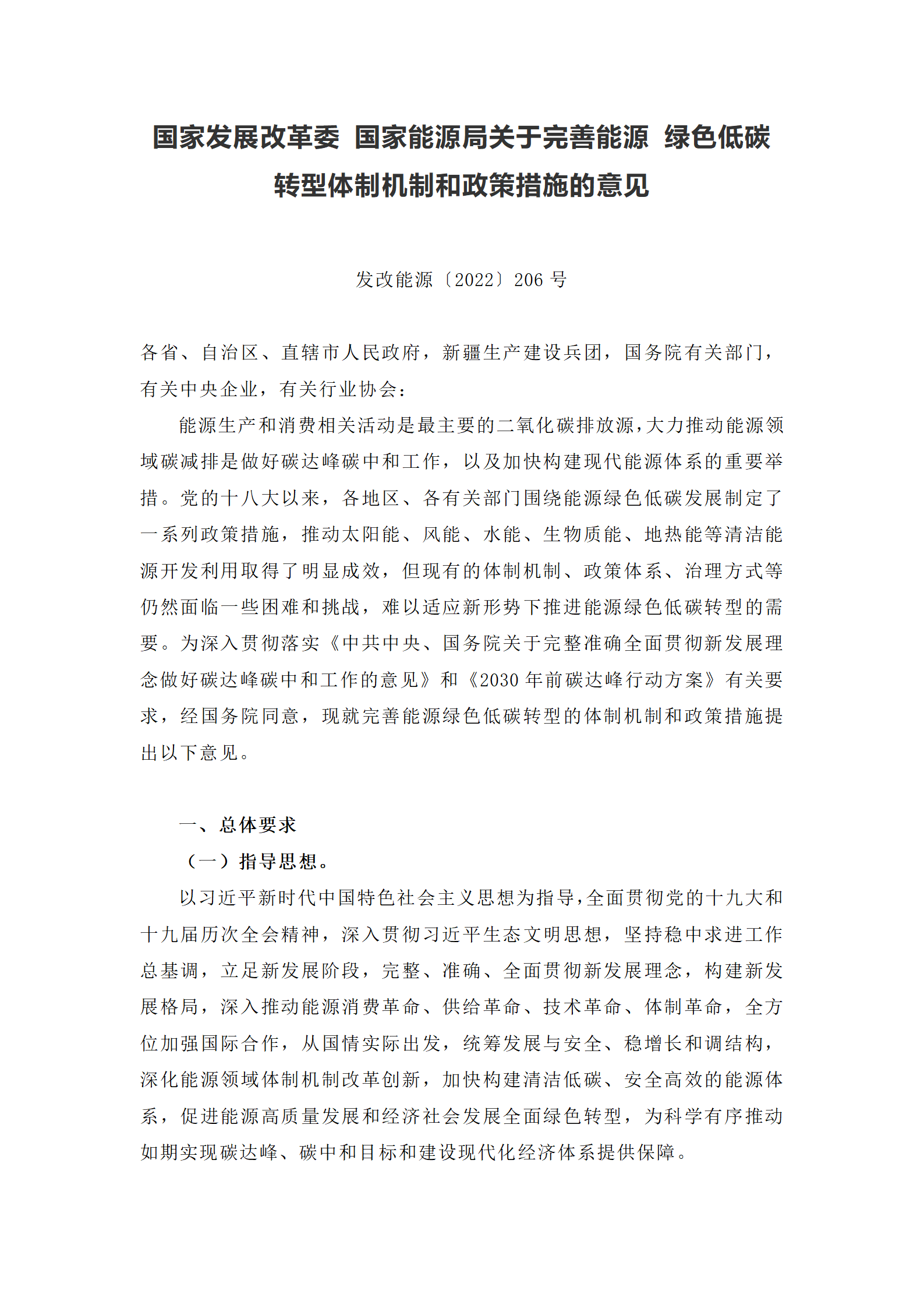 关于完善能源 绿色低碳转型体制机制和政策措施的意见