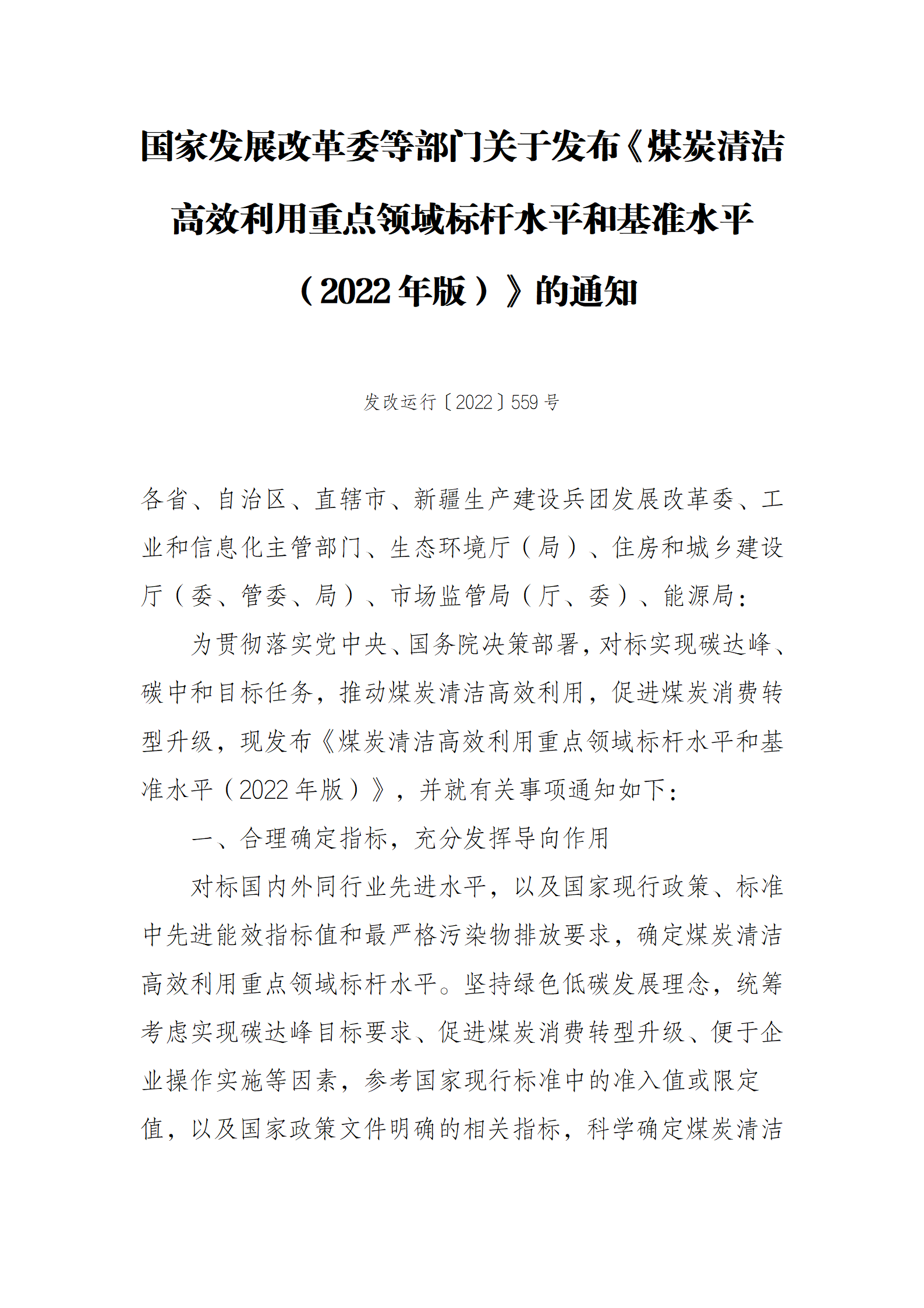 国家发展改革委等部门关于发布《煤炭清洁高效利用重点领域标杆水平和基准水平(2022年版)》的通知