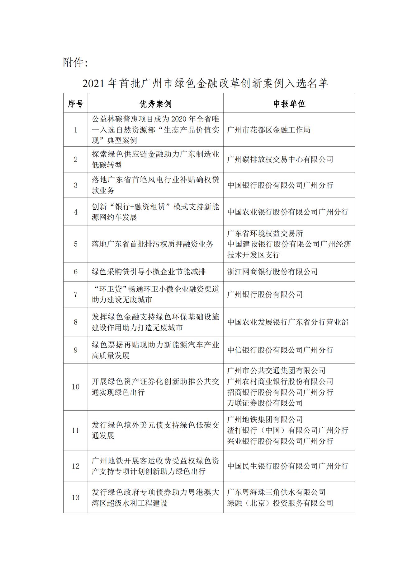 关于2021年首批广州市绿色金融改革创新案例征集活动入选案例公示的通知