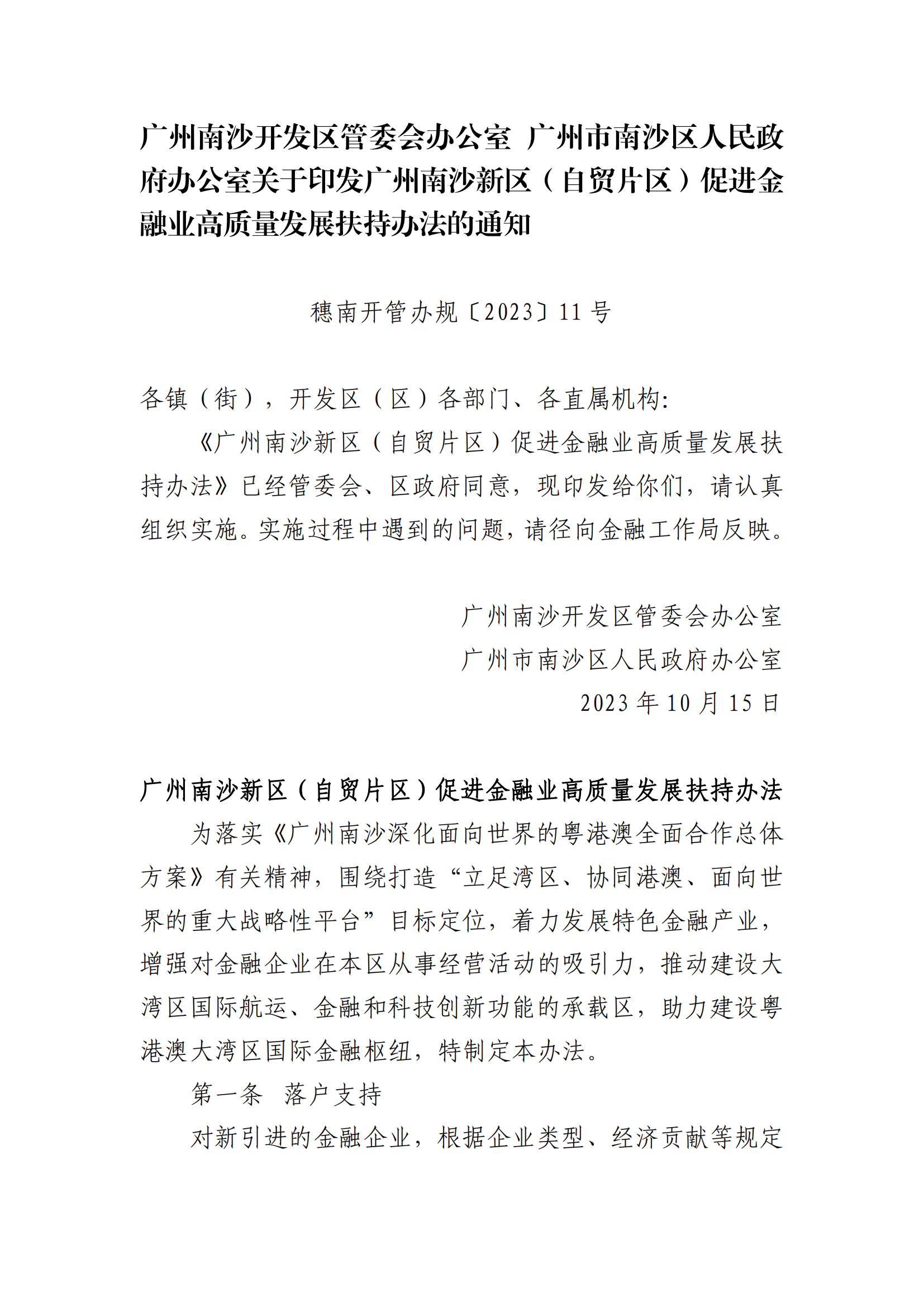 《广州南沙新区(自贸片区)促进金融业高质量发展扶持办法》